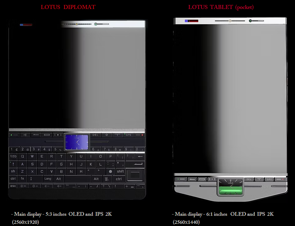 これは先月11月に発表された、Lotus Machines LLCなる新興企業(自称)が提示し、Indiegogoで出資を受け付けている全く新しい携帯電話Lotus Phonesシリーズのひとつ、"Diplomat" の威容です(twitter(X)でフォロワーに教えてもらえました。本当にありがとうございます)。